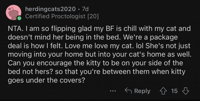The relationship you have with your pet can often be tested by new partners who may not understand the bond you share. According to Dr. Esther Perel, a renowned couples therapist, “When a partner feels threatened by a pet, it can create significant tension in the relationship.” Pets are family members, and if a new partner struggles to accept that, it may lead to deeper issues. As Dr. John Gottman, a leading marriage researcher, states, “The way we treat our pets can reflect how we treat each other.” If your partner is uncomfortable with your pet, it could become a deal breaker. However, as long as they can tolerate your pet, there may be opportunities for growth. In a recent discussion, a Redditor known as u/SR17740 shared how he told his girlfriend to "get over it" after she expressed discomfort about their cat sleeping on the bed. Scroll down to check out the full Reddit post!