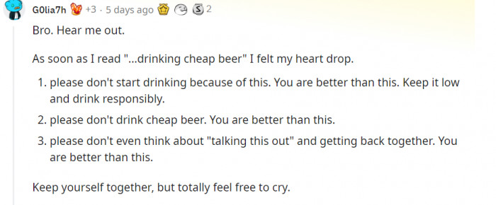 With the support of the community and a counselor, we're confident the Redditor will get through this difficult time.