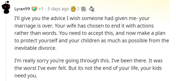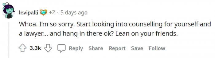 "Start looking into counseling for yourself and a lawyer."