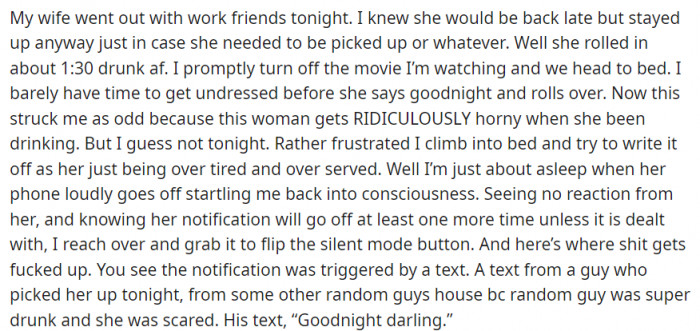 I’m sitting here, house quiet, nauseous and internally raging, drinking cheap beer, trying to figure out how we got here. I’d wake her up to confront her, but the kids are asleep, and I just don’t have the energy to fight tonight. There are six years down the fuckin' drain, bois.