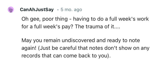 "Oh gee, poor thing - having to do a full week's work for a full week's pay? The trauma of it...."