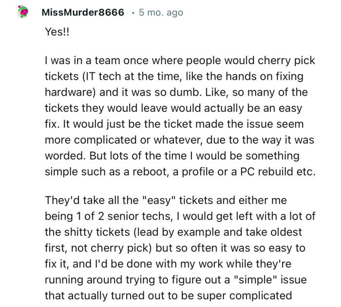 "I was in a team once where people would cherry-pick tickets, and it was so dumb."