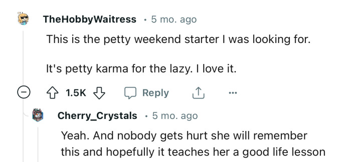 This is the best type of revenge. She learned an important life lesson without anyone getting hurt in the process