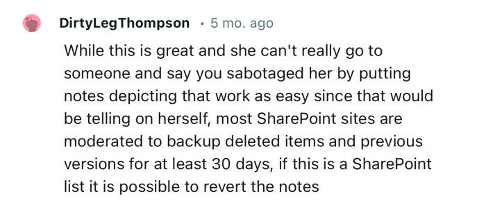 As the days went by, no one could go a minute without hearing her whine about how stressful her week was going. Worst of all, she couldn't return any of the tasks because SharePoint stamps the date/time/ID of the person who modified an issue.