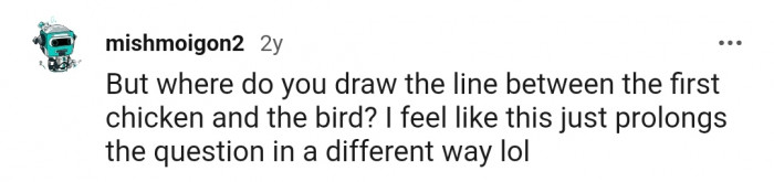 "But where do you draw the line between the first chicken and the bird?"