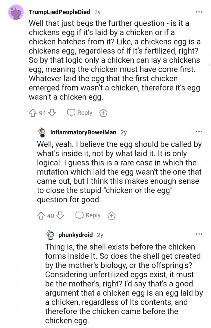 OP shared a link to an article on the TIL subreddit that reveals that scientists believe the egg came first, not the chicken.