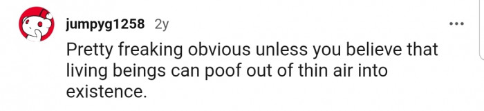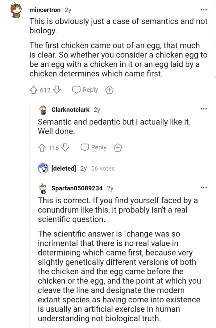 "Whatever laid the egg that the first chicken emerged from wasn’t a chicken, therefore its egg wasn’t a chicken egg."