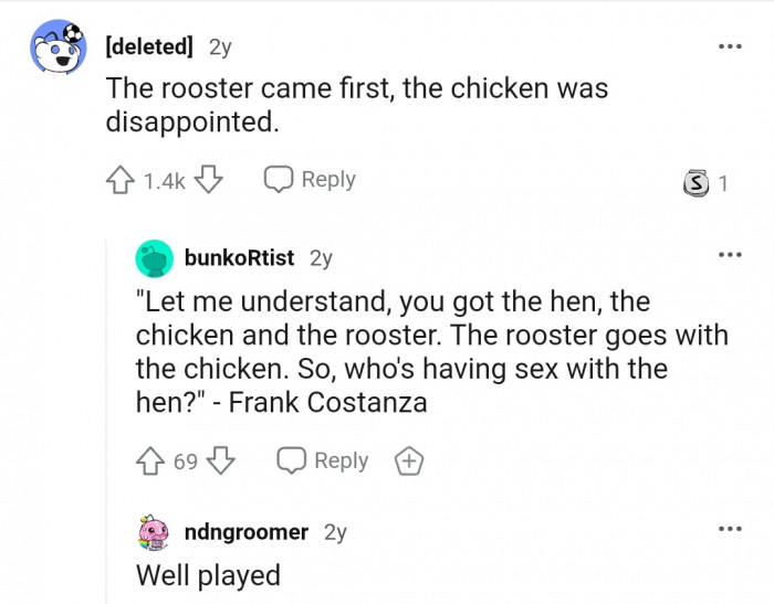 "The rooster came first."