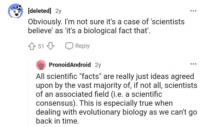 "I'm not sure it's a case of 'scientists believe' as 'it's a biological fact that.'"