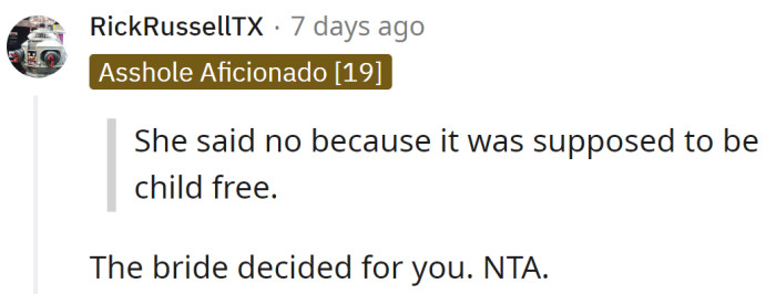 However, the bride wanted a child-free wedding and declined the OP's request. Then, the OP informed her that while she couldn't attend the ceremony, she could still go to the reception.