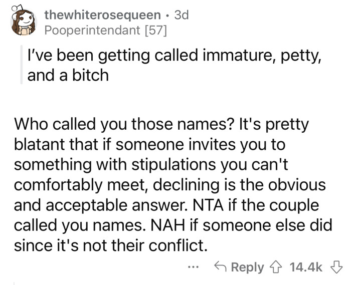 OP was called "immature" and "petty" for refusing to attend without her son, which made her doubt her decision.