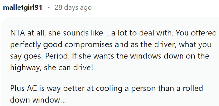 While OP doesn't mind this in city driving, he finds it distracting on the highway due to his ADHD. OP has discussed the issue with Rose and Alex, offering to use air conditioning instead, but Rose insists on having the windows down. OP stopped offering to drive when going out with Alex, Rose, and his girlfriend Paige.