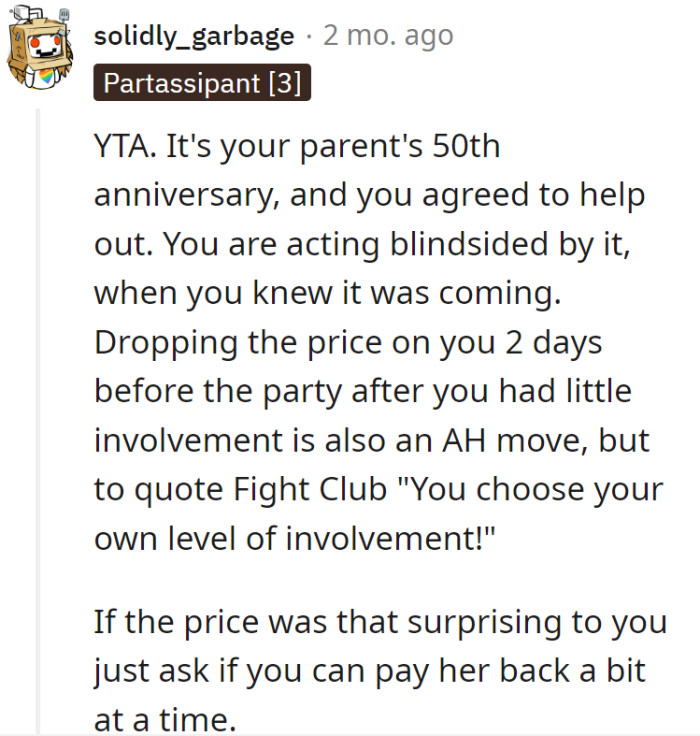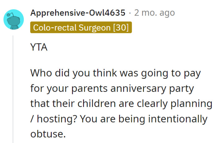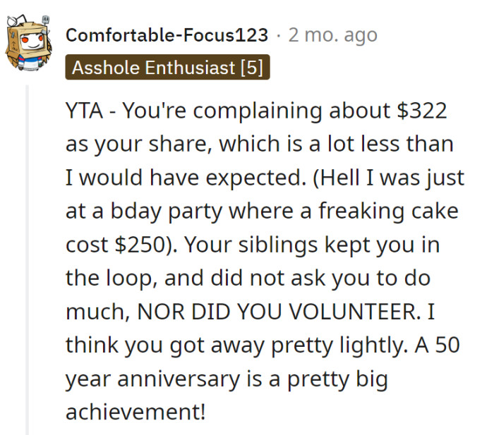 Youngest Child Gets Blasted For Not Paying For Their Parents' 50th Anniversary Party Because They Apparently Had No Hand In Planning It
