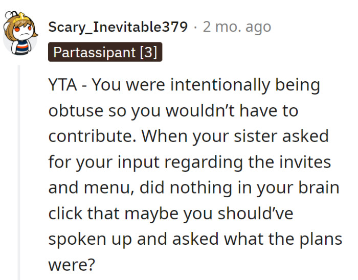 Throughout the following months, the youngest sibling received sporadic updates about the party, from save-the-date pictures to snippets of color schemes and cake preferences, with limited opportunities for input. Their involvement seemed restricted to occasional glimpses into the preparations.