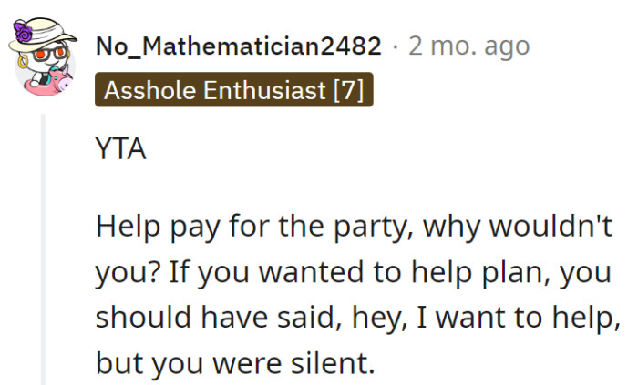 As the youngest of three siblings, residing four hours away from the familial hub in Texas, this person found themselves caught in the financial crossfire after their sister took charge of orchestrating a local celebration for their parents. The event planning, initiated in December with a suggestion for a trip back east, took an unexpected turn in March when the sister, without much prior consultation, informed them of the decision to host a local party.