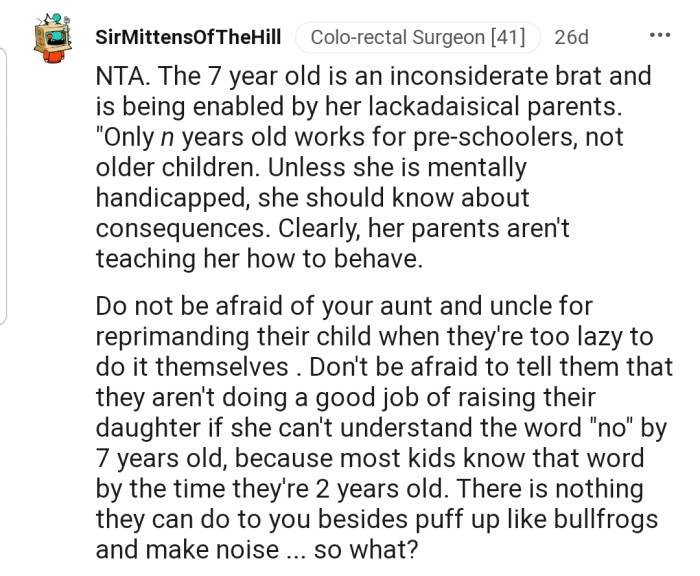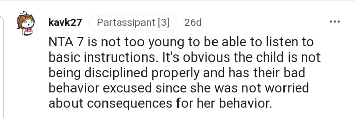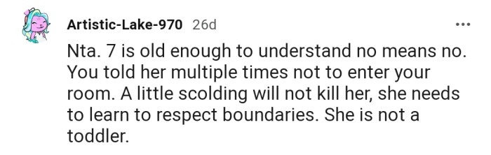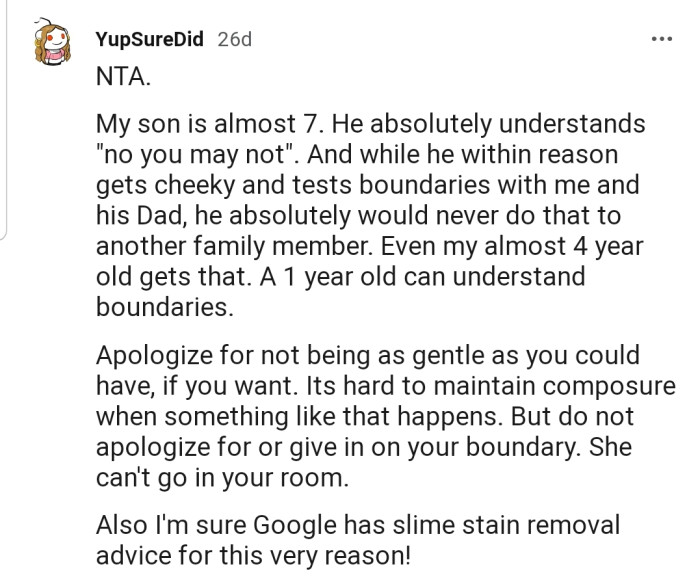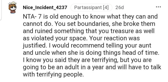 According to them, OP’s cousin is not too young to respect the boundaries OP had set, and her parents should never have blamed OP for reacting the way they did.