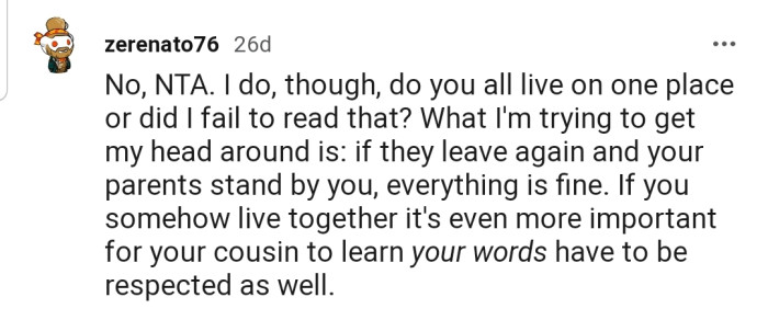 "If you somehow live together, it's even more important for your cousin to learn that your words have to be respected."