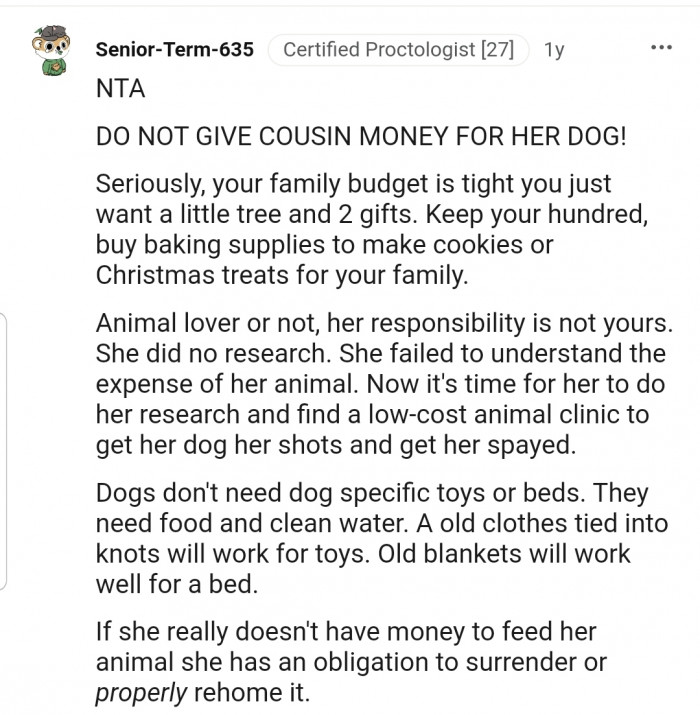 OP shared that they were on a tight budget because they had plans to buy Christmas presents for their family. However, their cousin needed assistance to cater to the dog she had just got.