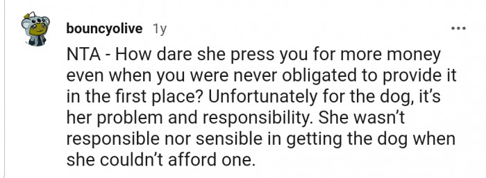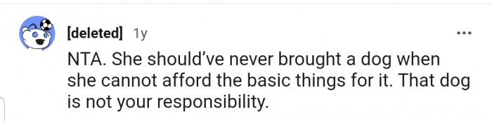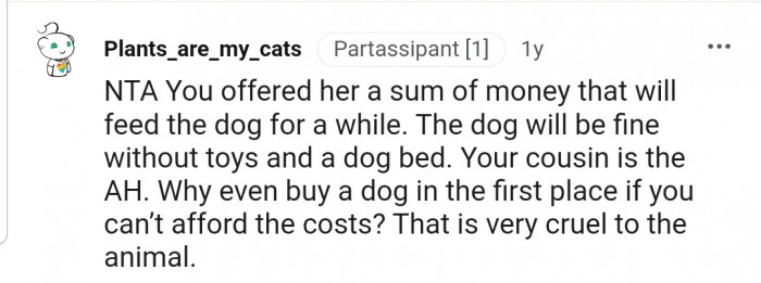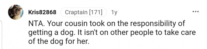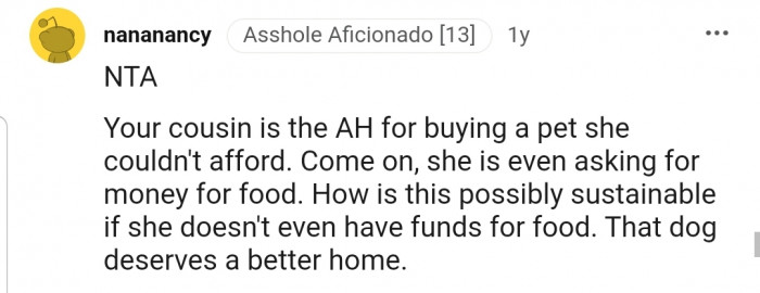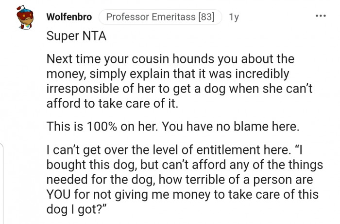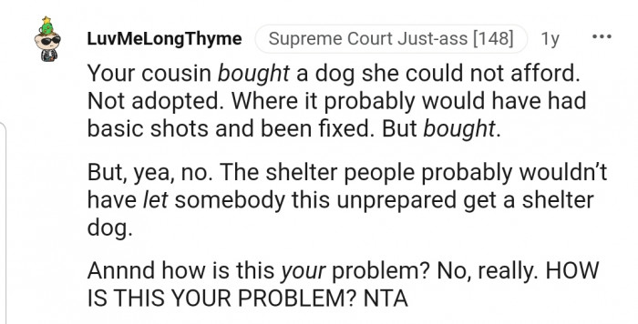 The Reddit community believes that OP's cousin was very irresponsible and shouldn't have gotten a dog without being able to take care of it. They weren't fans of her seemingly entitled attitude, and they didn't hold back on telling OP this.