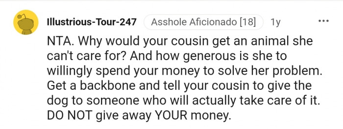 We found a Redditor who had her priorities set and had plans to stick to them until their cousin started requesting some money for her dog.