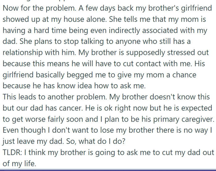This imposed ultimatum left the brother contemplating cutting ties with OP, resulting in his girlfriend pleading with OP to give their mother a chance. Adding another layer to this already convoluted situation, OP holds a significant secret: their father's cancer diagnosis.