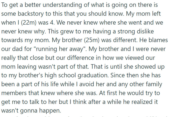 OP, just 4 years old at the time, harbored a growing disdain for his absent mother, while his brother, three years his senior, projected the blame onto their father, accusing him of driving their mother away. Their mother's unexpected reappearance at the brother's high school graduation only deepened the divide, as she became an active part of the brother's life while OP continued to avoid her.