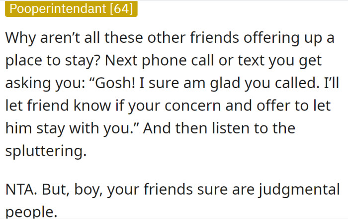 Moreover, the Redditor might consider offering alternative forms of support that don’t compromise their comfort, such as helping their friend find other temporary housing options or resources.