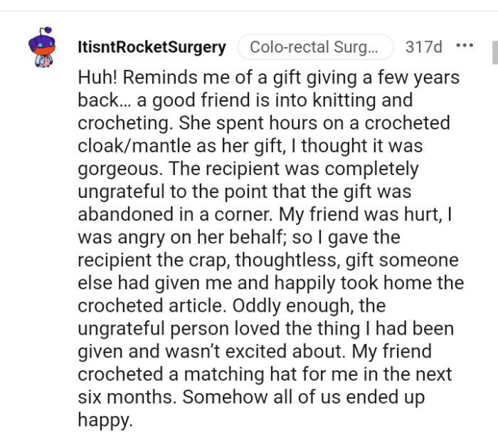 1) I called the gifts that I received horrible.2) I may be the asshole, but I acted ungrateful for what I received.Let's head into the comments section and find out what other Redditors have to say regarding the story
