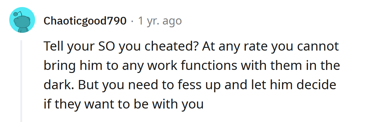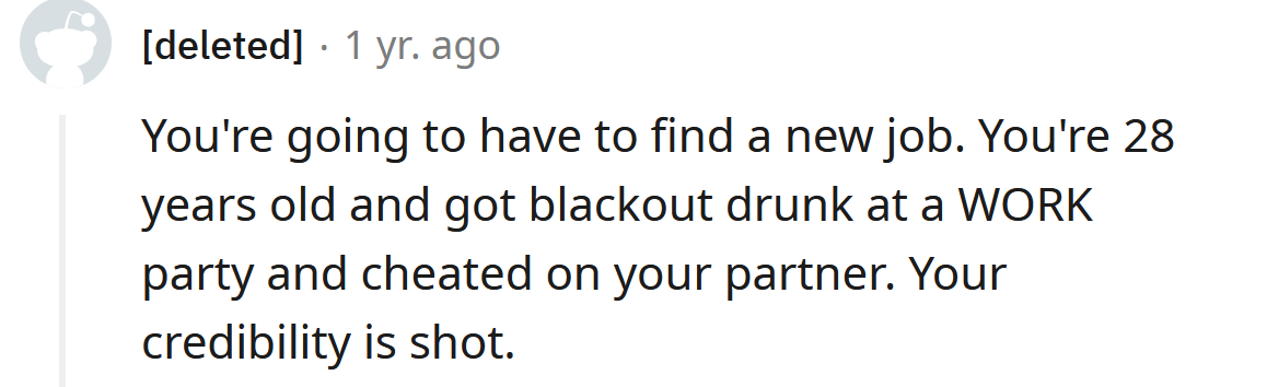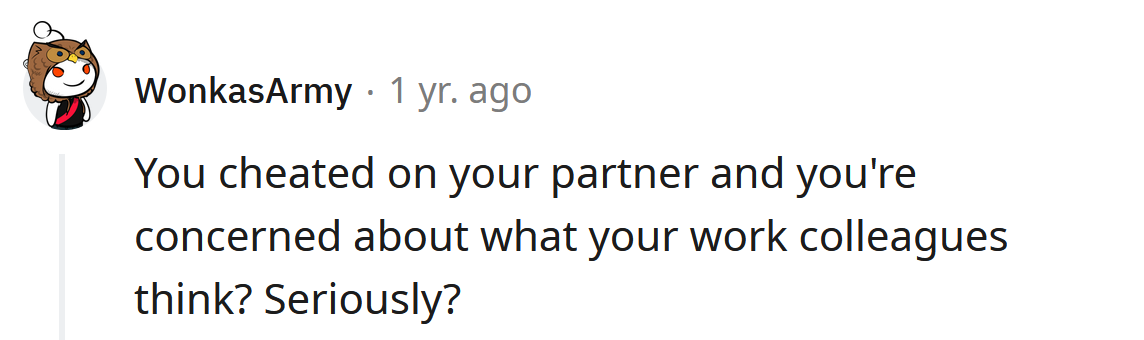 Now, the OP says that all of her coworkers look at her strangely, and she is embarrassed that they all know her personal business. Some of them had even tried to talk her out of cheating on her partner during the party.
