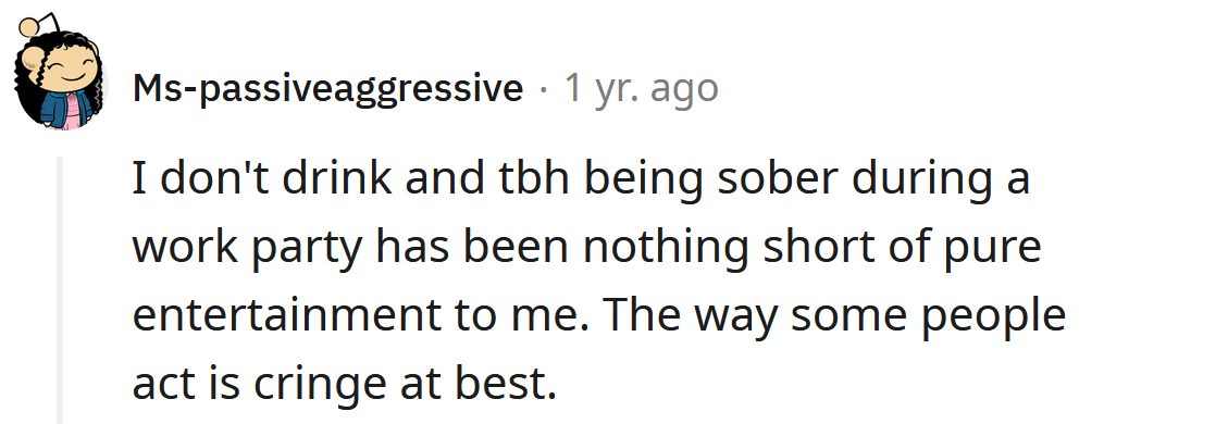 "Being sober during a work party has been nothing short of pure entertainment to me."