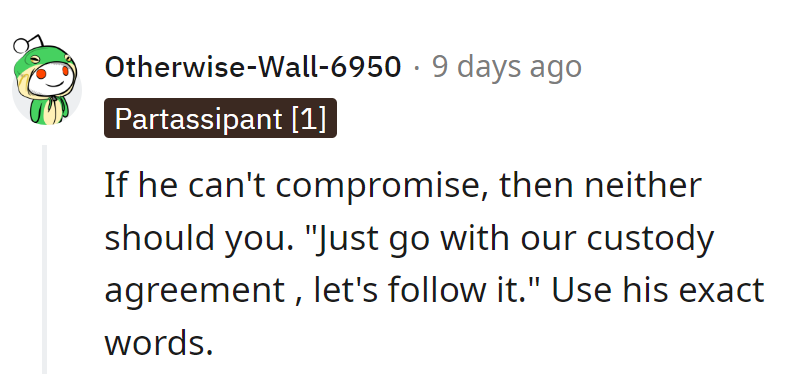 This refusal disrupts the previously unspoken rule of mutual compromise, leading her to a staunch decision to adhere strictly to the custody agreement. Her stance, though perceived as petty by her ex-husband, highlights the often unappreciated give-and-take in co-parenting arrangements.