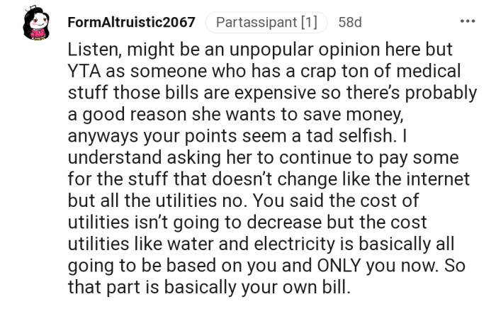 Doctor appointments, located an hour away, require her presence, leading her to contemplate spending more time at home. Eager to save money during this period of transition, she considers moving out or paying a reduced portion of utilities.