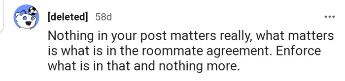 "Nothing in your post matters really; what matters is what is in the roommate agreement."