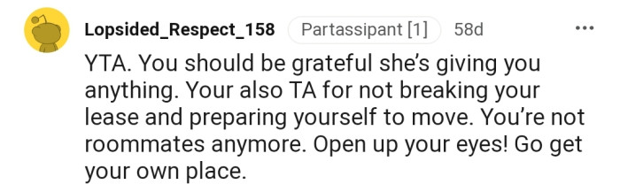As OP grapples with the challenging roommate situation, the scales of public opinion tip against her on Reddit. The online community seems to favor her roommate's proposed solution, viewing it as a fair compromise.