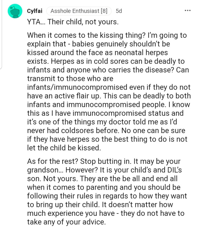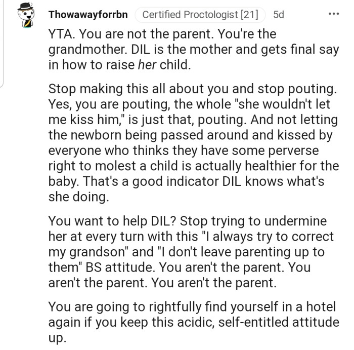 Family time was wonderful as usual, except for one tiny problem: OP was frustrated that anytime she tried correcting her three-month-old grandson, her DIL would interject. In addition, her DIL refused to allow her to kiss the baby, which hurt her even more.