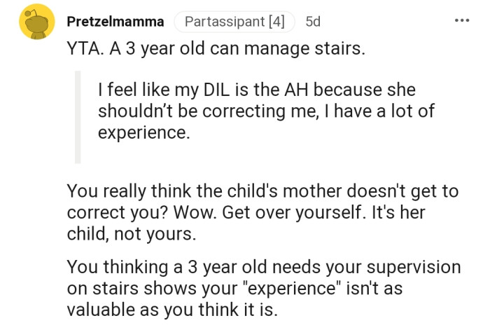 "You really think the child's mother doesn't get to correct you? Wow. Get over yourself."