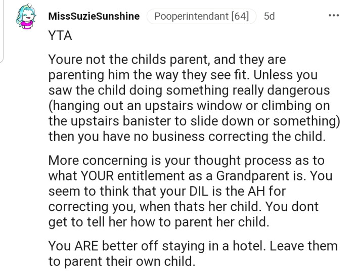 "You ARE better off staying in a hotel. Leave them to parent their own child."