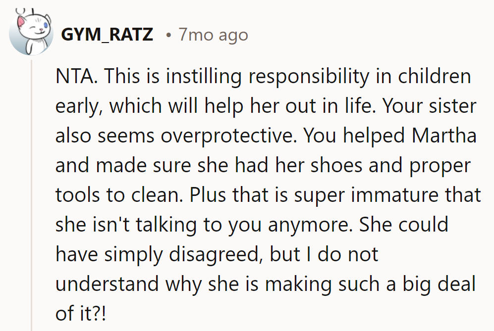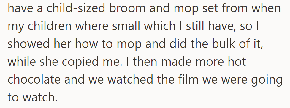 Maybe next time, she’ll use plastic cups for hot chocolate, but one thing’s for sure—Martha now knows how to handle a mini mop like a pro. In the grand cleanup of life, it seems both sisters learned a little something about balancing safety and teaching responsibility.