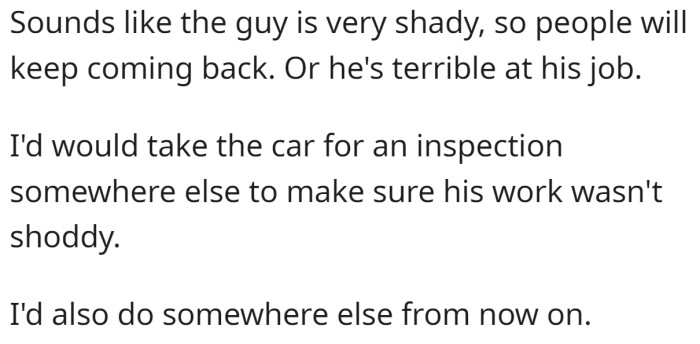 However, a recent incident made them question that. OP has had their car serviced at the family’s successful garage, for which they paid the full bill.