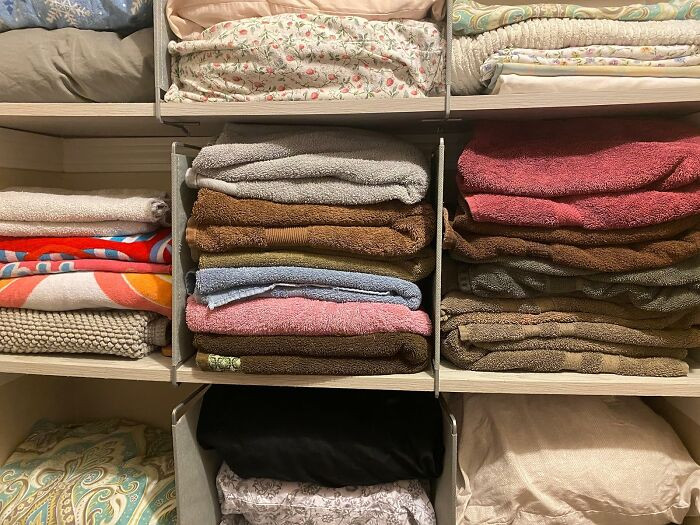"The Leaning Tower of Pisa Has Nothing On Your Stack Of Bath Towels, But It Can All Be Fixed with linen closet Shelf Dividers."