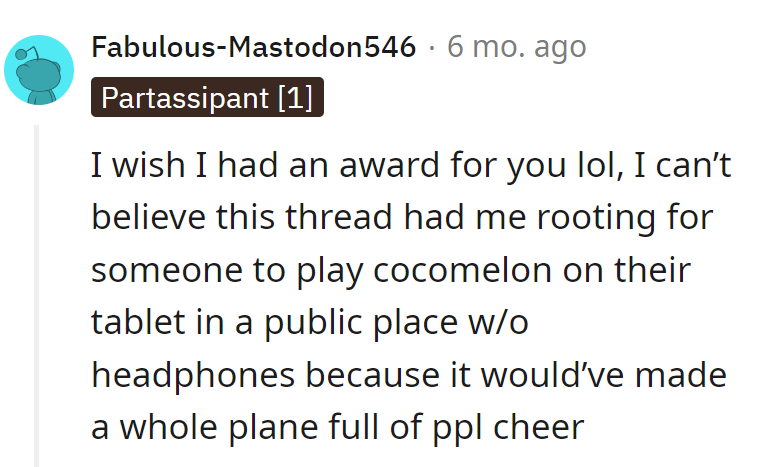 "I can't believe this thread had me rooting for someone to play Cocomelon on their tablet in a public space without headphones."