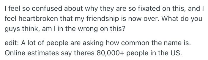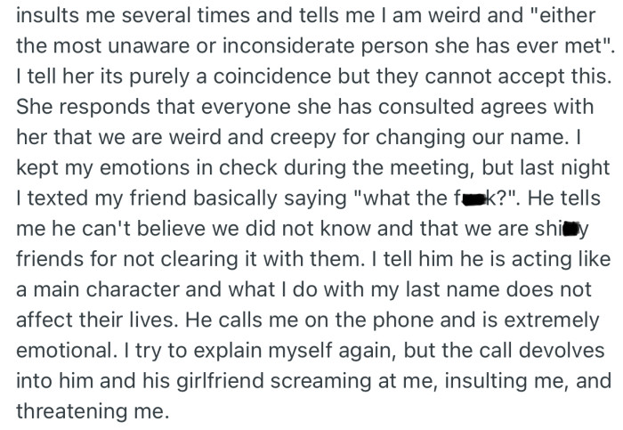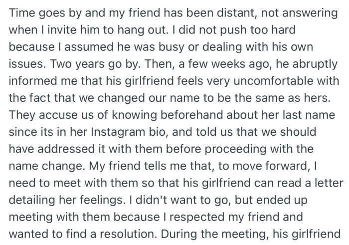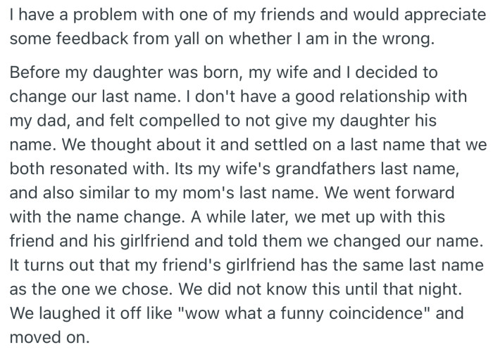 “The friend's girlfriend's family doesn't own the last name, and they're both being really weird about this.”