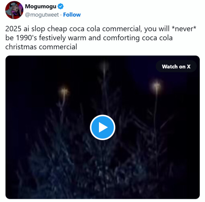 Others chimed in to mourn what they see as the death of genuine holiday spirit: “2025 AI slop cheap Coca-Cola commercial, you will never be 1990’s festively warm and comforting Coca-Cola Christmas commercial.”