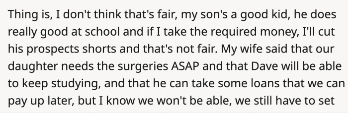 Dave is a good student, and if OP withdraws some cash from his fund, he will be compromising his son's future. His wife insists that they have to do this now because Rose needs the surgery immediately, plus Dave can just take out some loans that they can pay back later.