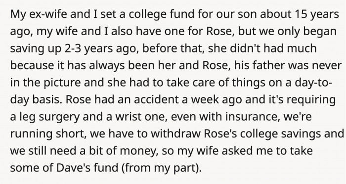 OP and his ex-wife planned accordingly and set up a college fund for Dave. Rose has one too, but that fund was only started two years ago.