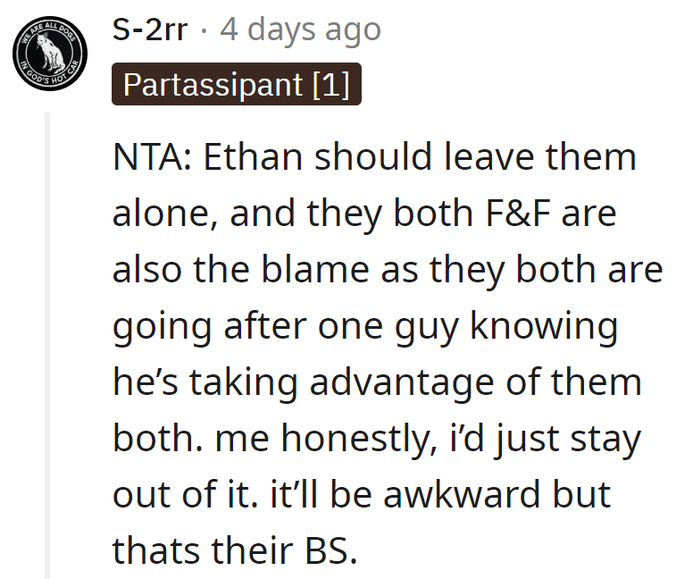 OP faces awkwardness as Ethan, dating Rebecca, cheats with Ashley, claiming it's for "equity" to mend their friendship.