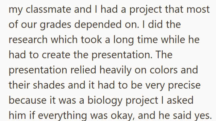 A group project should be the easiest kind of stress, right? For OP, it turned into a full-on deadline panic when their colorblind classmate stayed quiet until it was too late to fix the mess. The part that stings is that this was not a small misunderstanding, it was the kind that can tank your grade in one night.