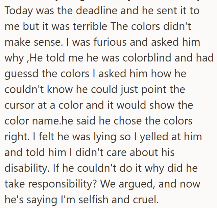This story resonates with readers because it taps into the universal struggle of managing expectations in group work. The OP probably entered the project hoping for a smooth collaboration, expecting their classmate to contribute equally. However, when that expectation meets the reality of hidden challenges—like colorblindness—it can lead to feelings of betrayal and anger.