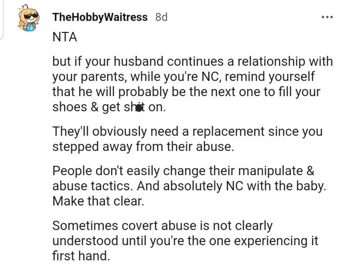 "If your husband continues a relationship with your parents, while you're NC, remind yourself that he will probably be the next one to fill your shoes & get sh*t on."