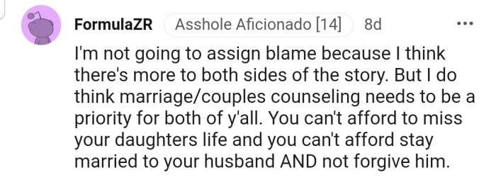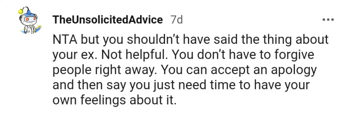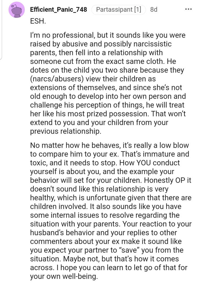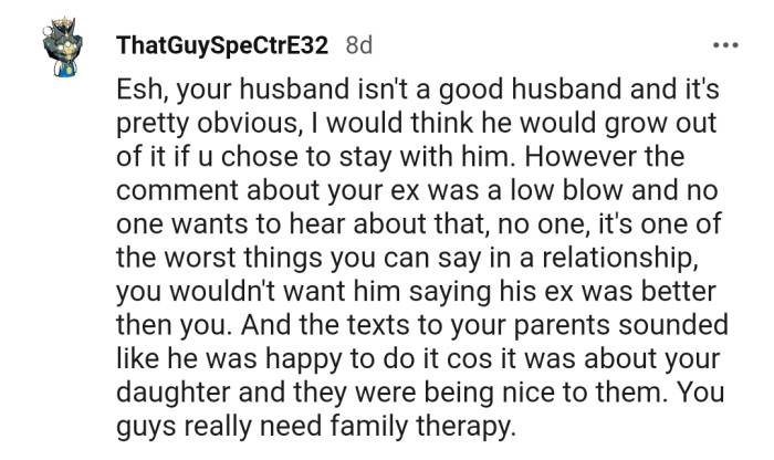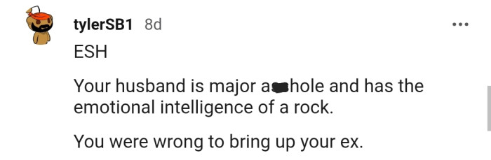The Reddit community has decided to side with OP on this matter. However, OP didn't go scott-free for comparing her husband with her ex.